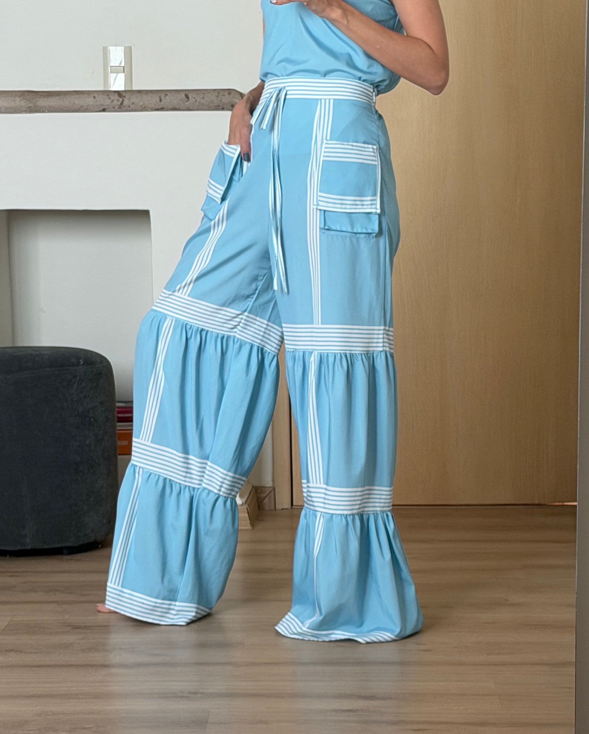 Nuestro Set Ciao, compuesto por un top de tirantes delgados y un pantalón de pierna ancha con vuelo. Su diseño fresco, femenino y moderno lo convierte en una opción ideal para los días soleados o para un look casual con estilo. Las franjas blancas añaden un toque náutico y elegante, mientras que su tela ligera garantiza comodidad durante todo el día.