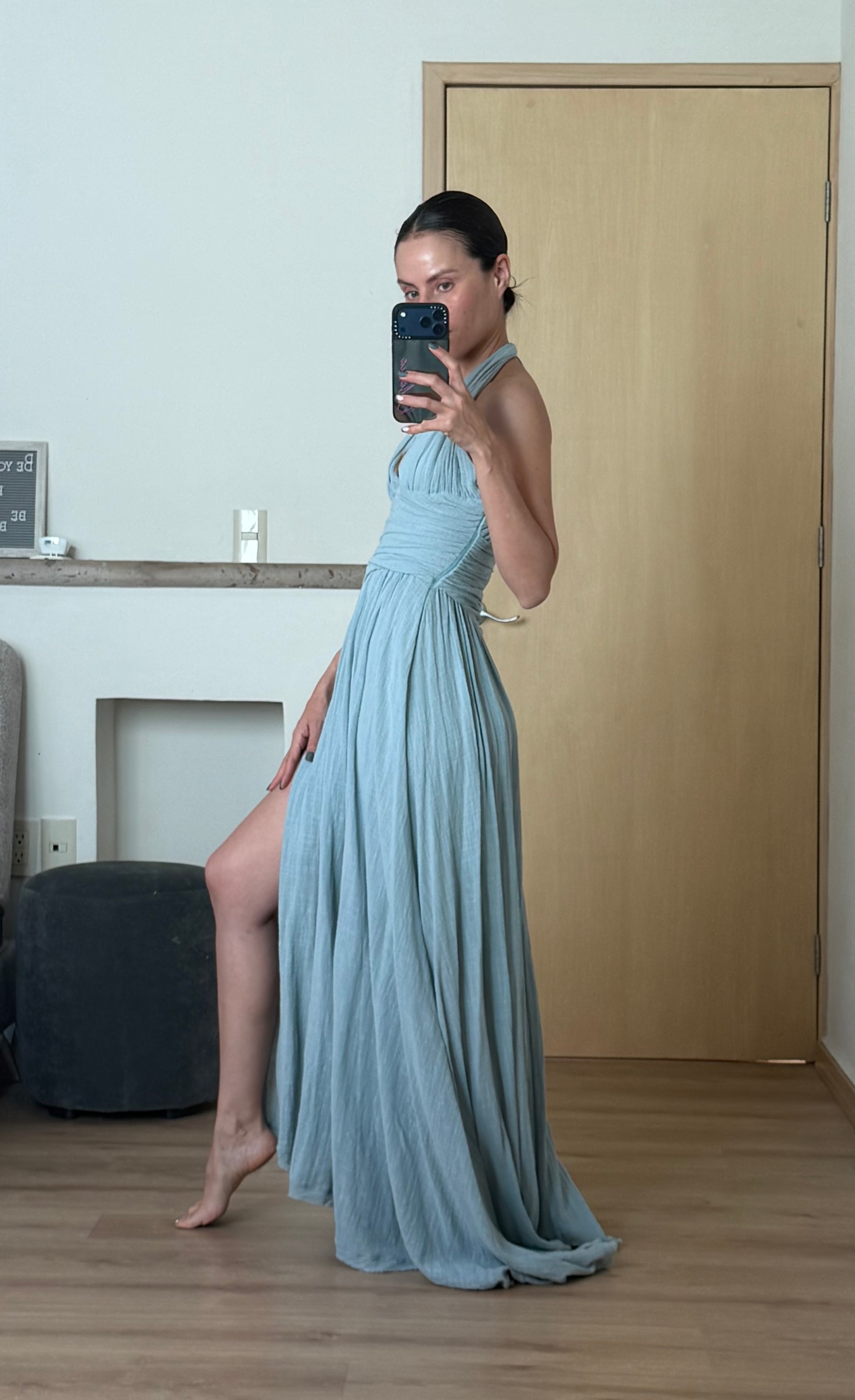 Fresca y elegante con este vestido fluido de tela ligera, ideal para los días más cálidos. Su escote halter realza los hombros y añade un toque sofisticado.